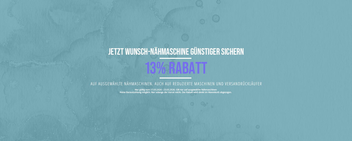 Nutzen Sie jetzt die Gelegenheit und sichern Sie sich 13 % Rabatt auf ausgewählte Nähmaschinen. Ob für Einsteiger, ambitionierte Hobby-Näherinnen oder erfahrene Profis – eine hochwertige Nähmaschine erleichtert das Nähen und sorgt für präzise, saubere Ergebnisse bei jedem Projekt.