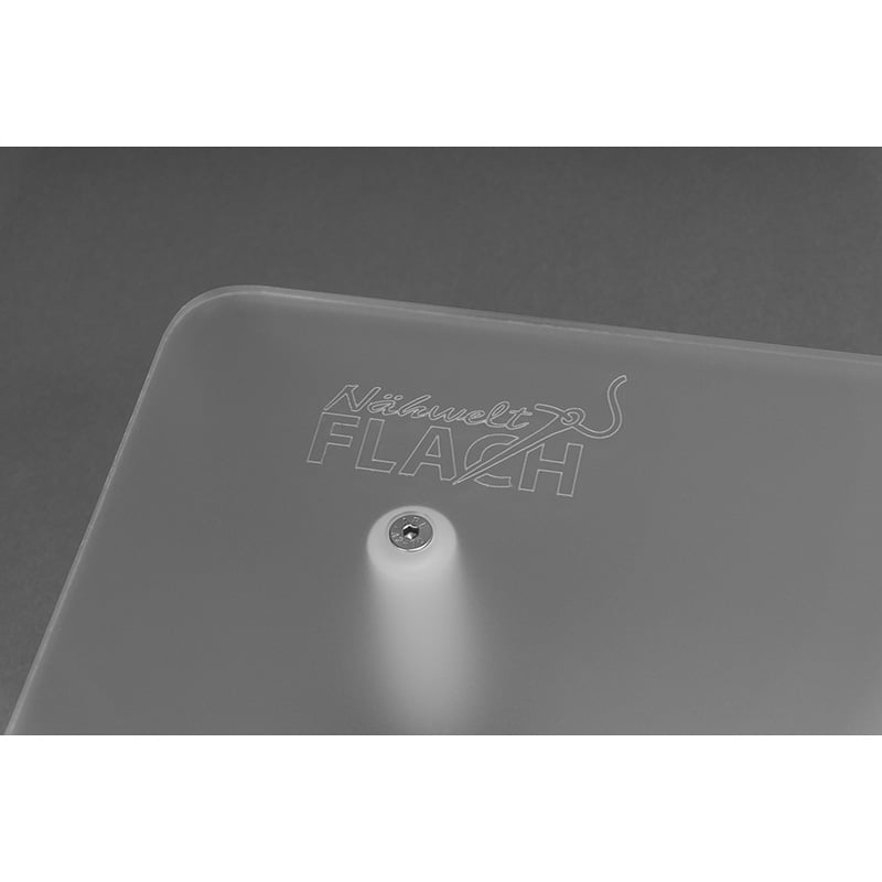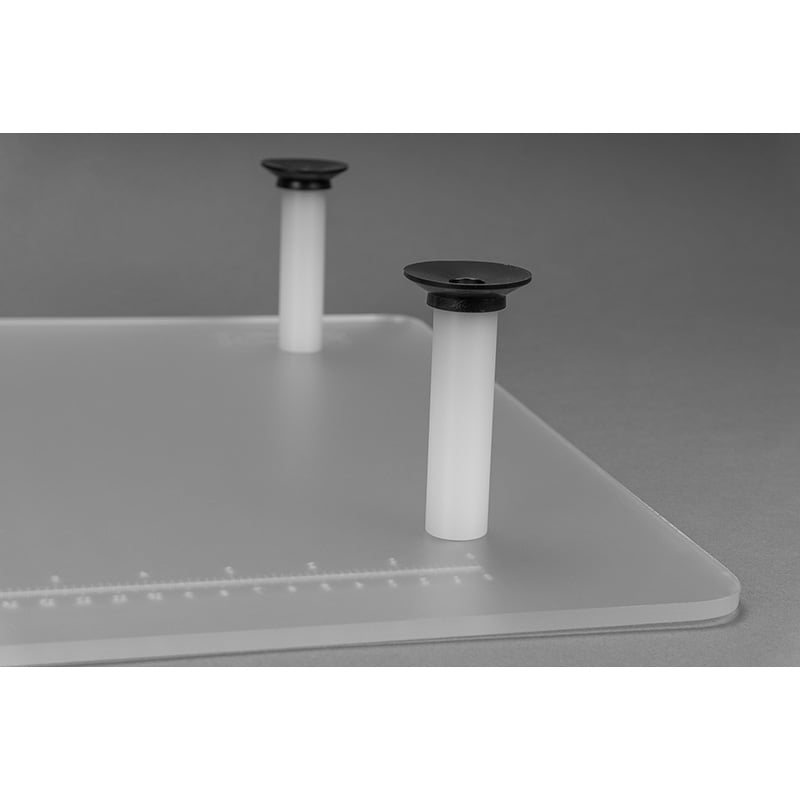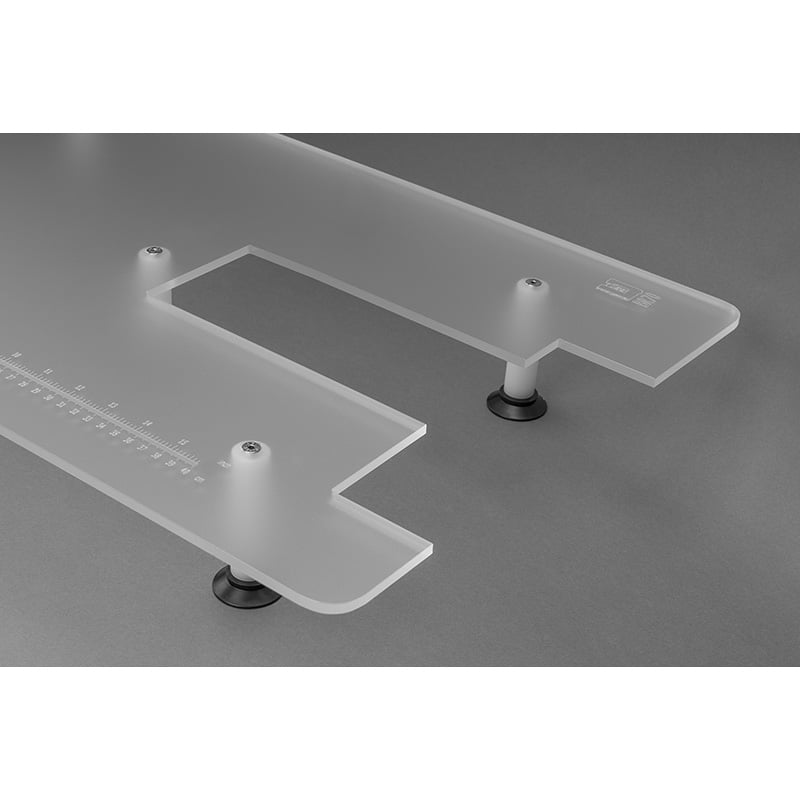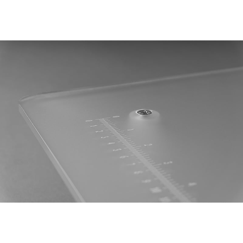Dank der robusten Konstruktion aus 6 mm starkem Acrylglas und höhenverstellbaren Gummifüßen steht der Tisch besonders stabil – ganz gleich, auf welchem Untergrund. Die eingeprägte Skalierung in Zentimeter und Inch hilft Ihnen zusätzlich beim exakten Arbeiten.