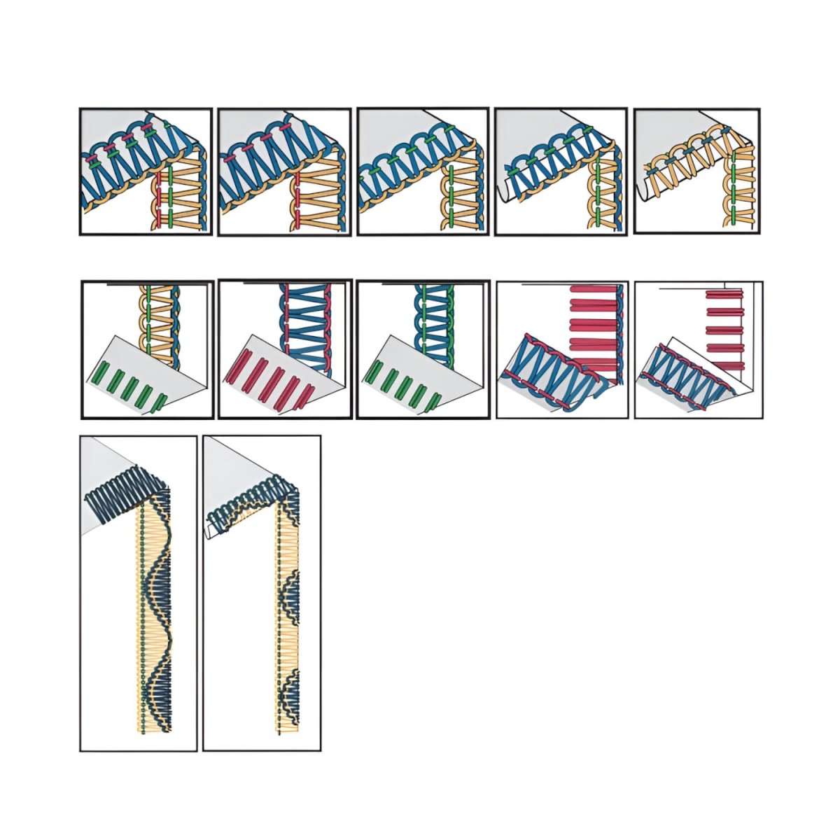 - Sticharten: 4-Faden Overlock, 3-Faden Overlock, 3-Faden Flachnaht, 3-Faden Rollsaum, 3-Faden Rollnaht, 2-Faden Overlock, 2-Faden Flachnaht, 2-Faden Rollsaum, 2-Faden Rollnaht, 2-Faden Picostich, Wave-Naht, Satin-Naht