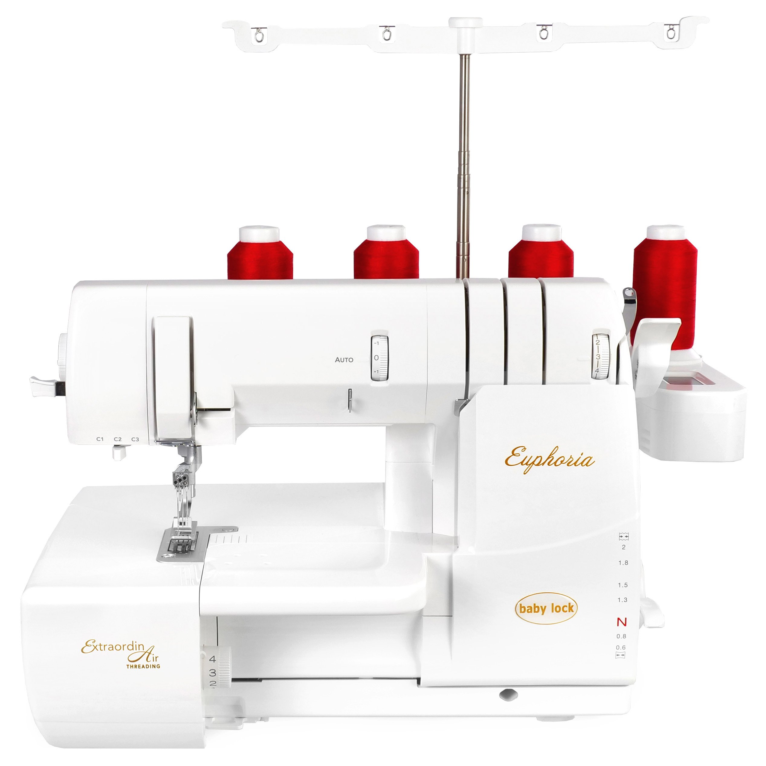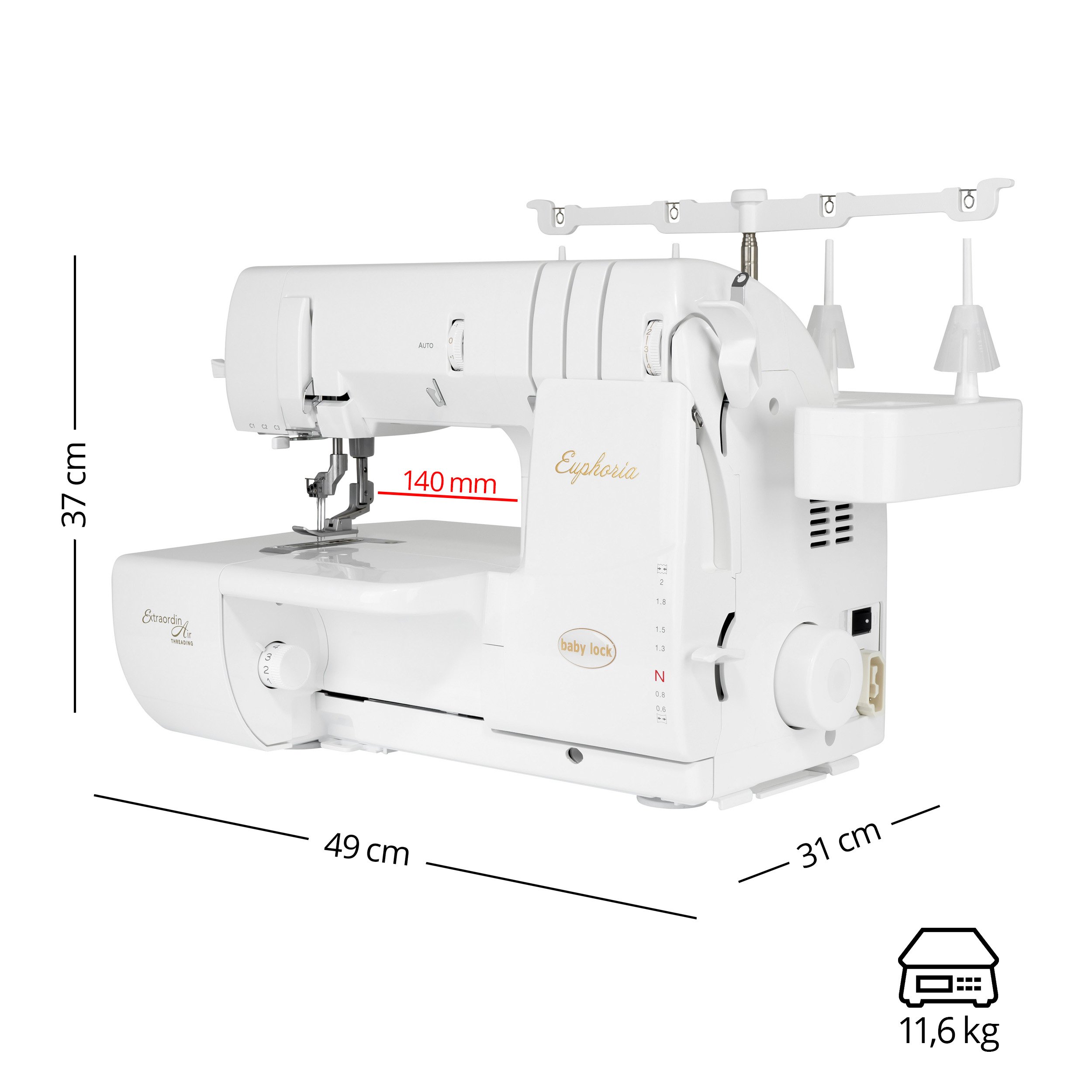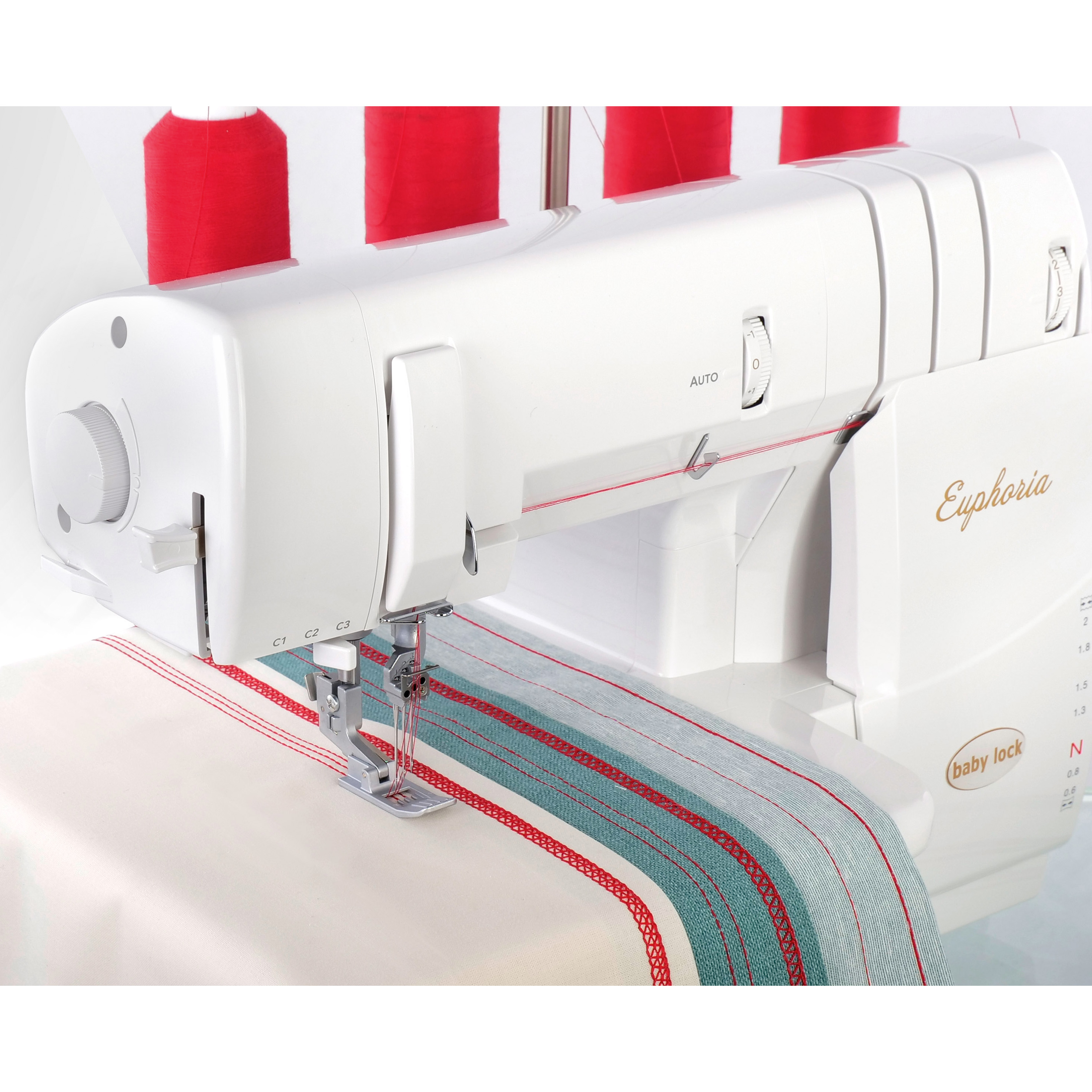 Die Baby Lock Euphoria ist eine Coverstichmaschine der Extraklasse. Mit ihrem breiten Durchlass können Sie auch große Stoffe problemlos mit professionellen Coverstichen verzieren.