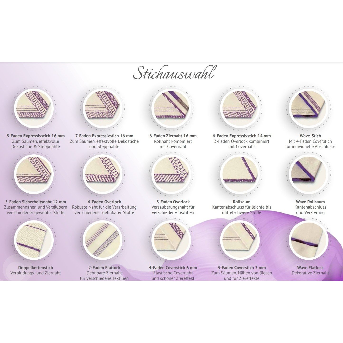 Die Gloria überzeugt mit einer großen Auswahl an Nähten und außergewöhnlichen Zierstichen, besonders hervorzuheben ist der Wave-Stich.