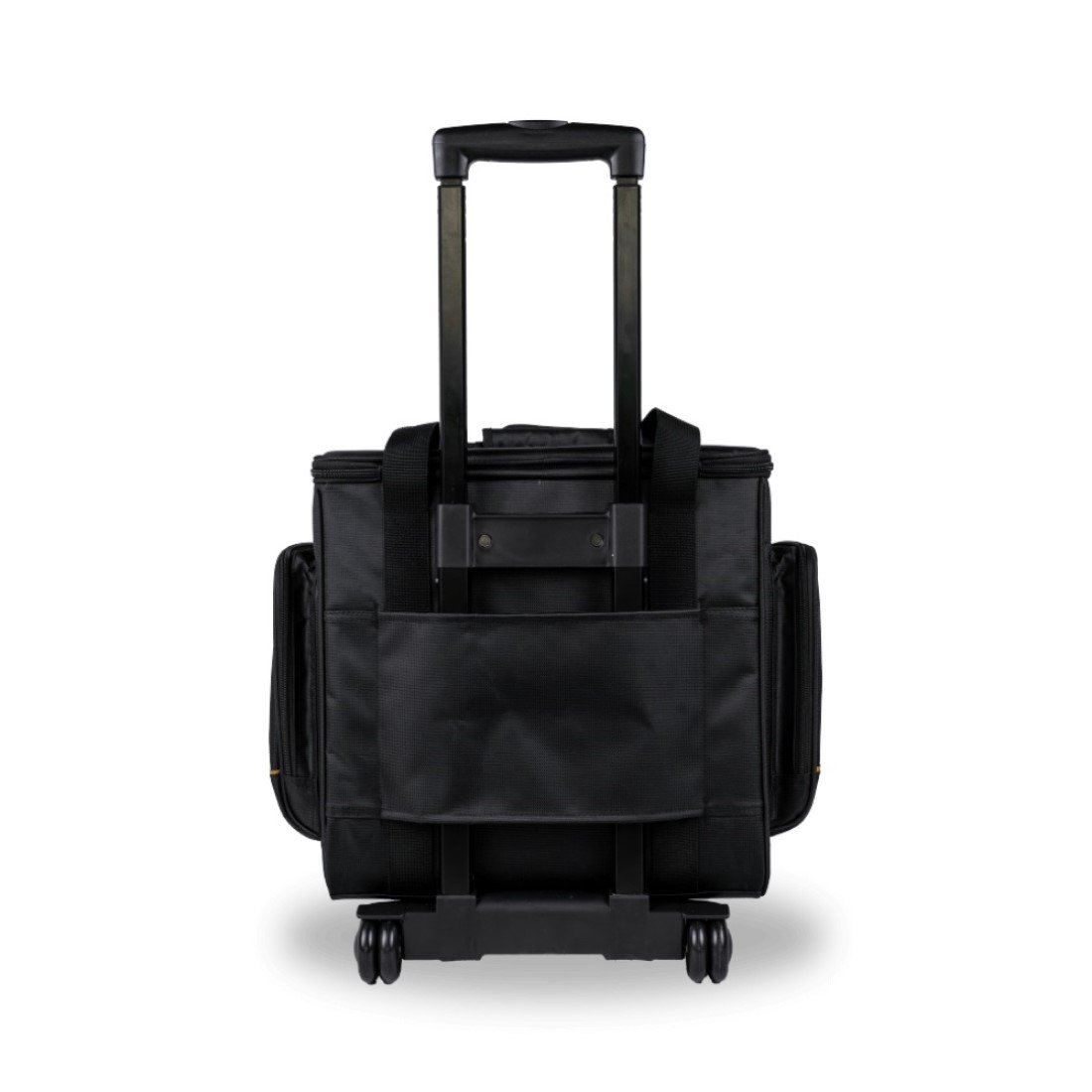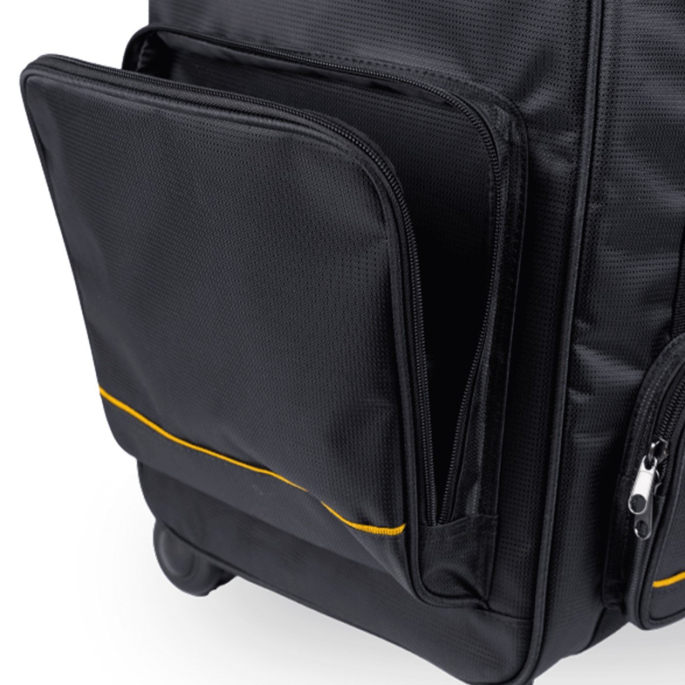 Dank seines kompakten Formats bleibt der Trolley leicht und handlich, bietet aber dennoch überraschend viel Stauraum. Im Innenbereich befinden sich mehrere Fächer für Zubehör wie Nähfüße, Garne oder Werkzeuge, während außen zusätzliche Taschen schnellen Zugriff auf häufig benötigte Utensilien ermöglichen. Die große Frontöffnung erleichtert das Ein- und Auspacken der Maschine, ohne sie kippen oder anheben zu müssen.