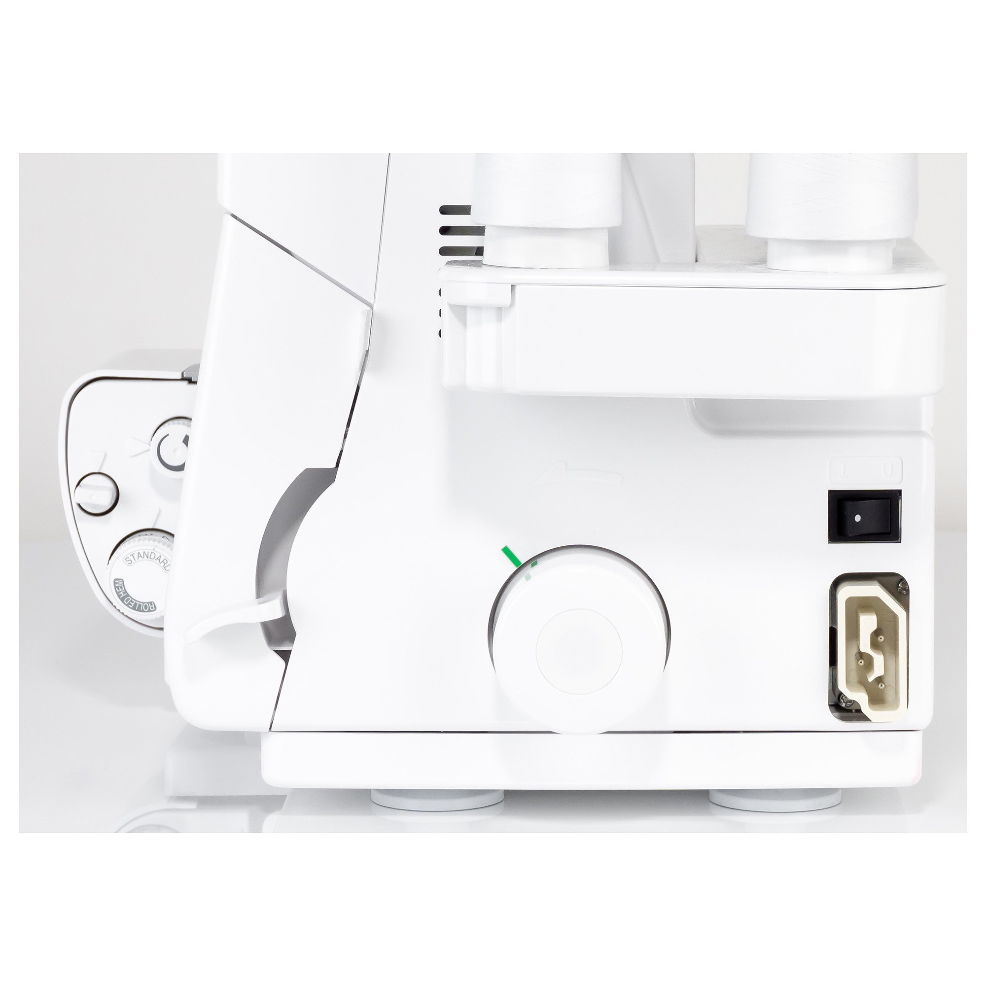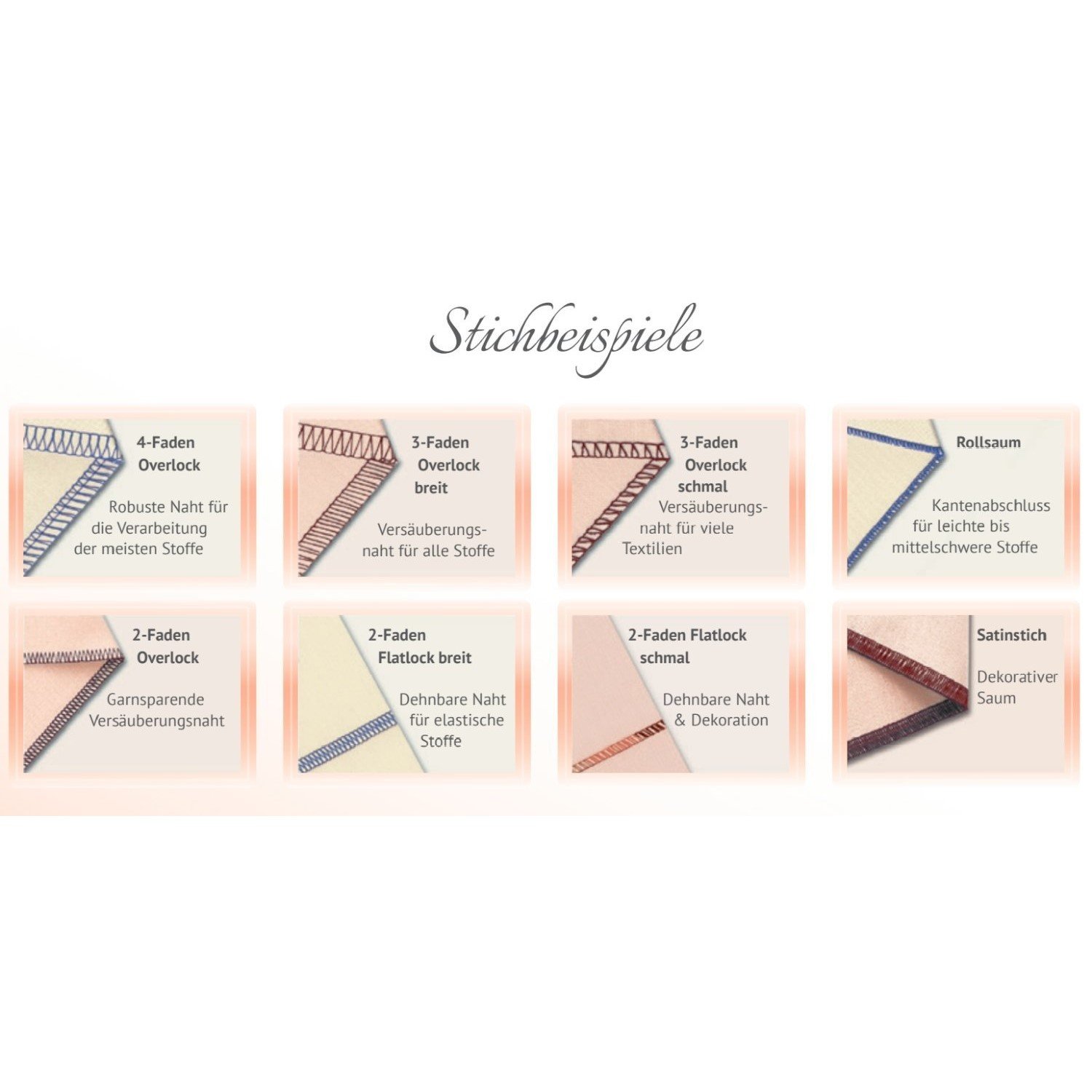 - Sticharten: 4-Faden Overlock, 3-Faden Overlock, 3-Faden Flachnaht, 3-Faden Rollsaum, 3-Faden Rollnaht, 2-Faden Overlock, 2-Faden Flachnaht, 2-Faden Rollsaum, 2-Faden Rollnaht, 2-Faden Picostich, Satin-Naht