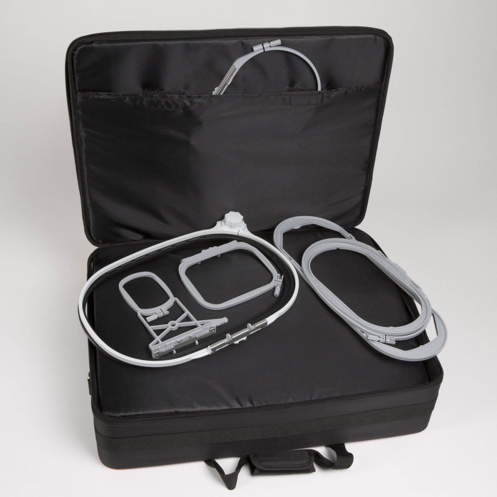 Der großzügige Innenraum lässt sich individuell an verschiedene Stickmodule anpassen. Seitenpolster sichern das Stickmodul und können bei Bedarf angepasst oder entfernt werden. Für Zubehör und Stickrahmen steht eine geräumige Außentasche mit Reißverschluss sowie ein großes Innenfach zur Verfügung. Die Tasche lässt sich bequem am Teleskopgriff des BERNINA Trolley XL befestigen oder dank Trageriemen komfortabel tragen.