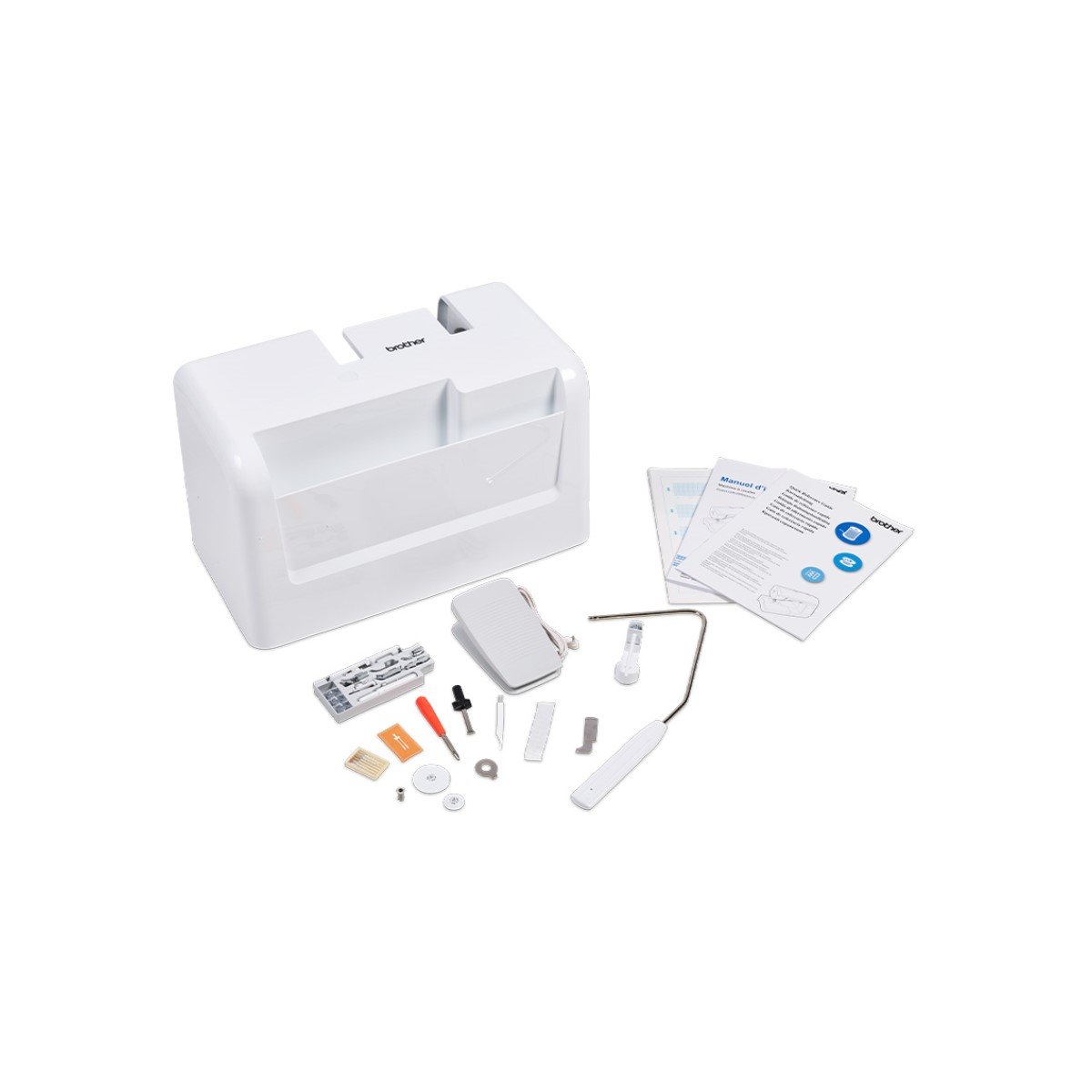 - Nadeln, Lampen, Nähfüße, Spulen, Messer, Werkzeuge, Stickrahmen