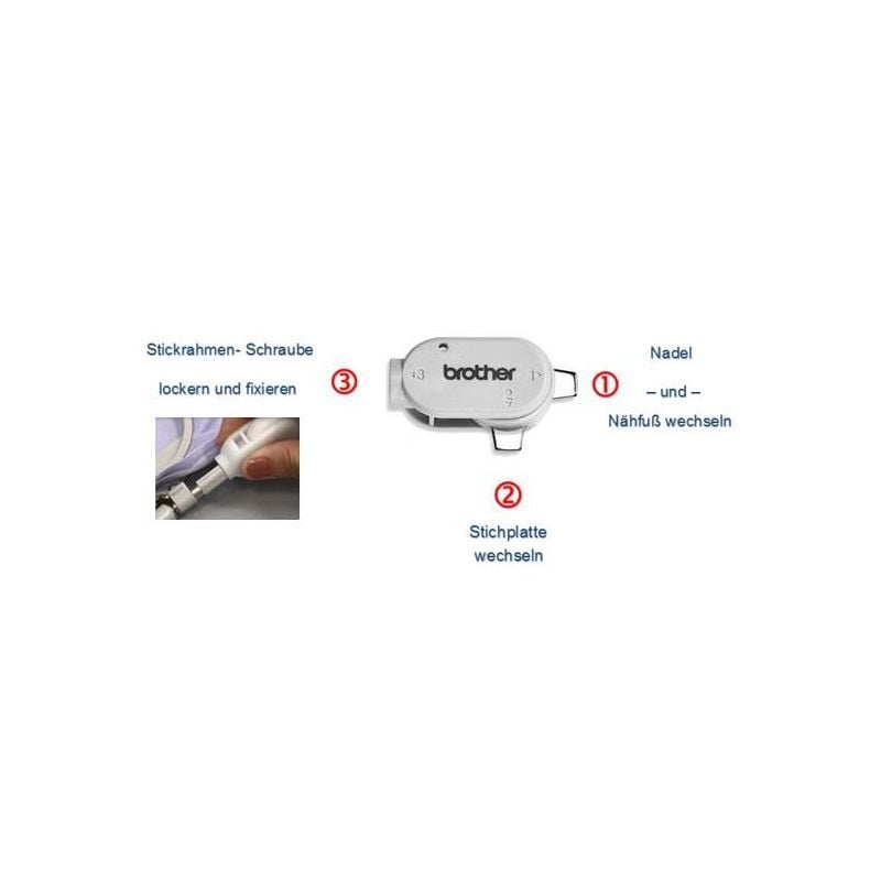 Der Brother Multifunktions-Schraubendreher ist ein echtes Multitool für Ihre Näh- und Stickmaschine. Er erleichtert Wartung und Pflege, z. B. beim Reinigen, Nadel- oder Fußwechsel und dem Entfernen der Stichplatte. Dank drei einstellbarer Positionen bietet er für jeden Handgriff die passende Höhe. Besonders praktisch: Die spezielle Öffnung in Position 3 erleichtert das Lösen oder Festziehen der Schrauben am Stickrahmen.