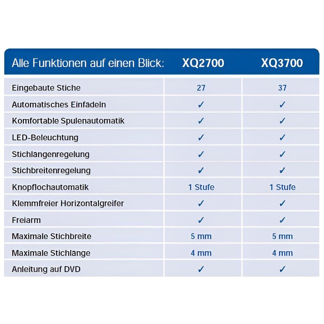 Brother XQ-3700 37 integrierte Stichprogramme Automatische Ein-Stufen-Knopflochfunktion Inklusive Anleitung auf DVD Komfortables Spulensystem Integrierter Nadeleinfädler Klemmfreier Horizontalgreifer LED-Beleuchtung für optimalen Arbeitsbereich Regelbare Stichlänge und -breite Freiarm-Nähen möglich 3 Jahre Herstellergarantie Zum PDF-Prospekt: Brother XQ 3700 Perfekt geeignet zum Nähen von Kleidung und Heimtextilien Die Brother XQ-3700 erleichtert Ihre täglichen Nähprojekte zuverlässig und zügig. Egal, ob Sie gerne Kleidung selbst herstellen oder Heimtextilien gestalten, diese Maschine bietet Ihnen viel Freude beim Arbeiten. Mit 37 integrierten Stichprogrammen und dem variablen Stichlängen- sowie Breitenregler passen Sie die Basisstiche flexibel an Ihre Wünsche an. Die Ein-Stufen-Knopflochautomatik sowie hilfreiches Zubehör ergänzen die umfangreiche Ausstattung ideal. Die Bedienung der XQ-3700 ist einfach: Die Stichwahl erfolgt per Drehknopf, und das Einfädeln gelingt schnell und unkompliziert. Die Arbeitsfläche ist durch blend- und schattenfreies LED-Licht optimal ausgeleuchtet. Je nach Stoffart können Sie den Freiarm verwenden, indem Sie die Zubehörbox am Anschiebetisch entfernen. So gelingt das Nähen von offenen und geschlossenen Stoffen mühelos. Das Wechseln der Nähfußsohlen ist dank des Snap-on-Systems besonders komfortabel. Die Nähfußfixierung sorgt bei wechselnden Materialien für eine konstante Stichqualität. Eine Abdeckhaube schützt die Maschine vor Staub und Verschmutzung. Stichwahlrad Die einfache Auswahl der Stiche erfolgt über ein Rad – sofort einsatzbereit. Stichübersicht Die 37 Stichprogramme erfüllen alle gängigen Anforderungen. Wichtige Funktionen Alle Hauptfunktionen wie Fadenspannung, Stichbreite, Stichlänge und Rückwärtsnähen sind zentral angeordnet und leicht erreichbar. Unterfaden-Schnellautomatik Einlegen der Spule und Fadenführung sind schnell erledigt – direkt startklar. Nadeleinfädler Mit nur einem Handgriff ist der Faden in der Nadel – besonders komfortabel. 3 Jahre Garantie Brother gewährt für Endverbraucher eine Garantie von 3 Jahren. Lieferumfang Nähfuß J Knopflochfuß A Reißverschlussfuß I Stopfplatte Knopfannähfuß M Spulen Nadelsatz Ovaler Schraubendreher Fußpedal Abdeckhaube Bedienungsanleitung Autorisierter Fachhandelspartner Als zertifizierter Fachhändler für Brother Näh- und Stickmaschinen bieten wir Ihnen kompetente Beratung und einen erstklassigen Service in unserer Fachwerkstatt.