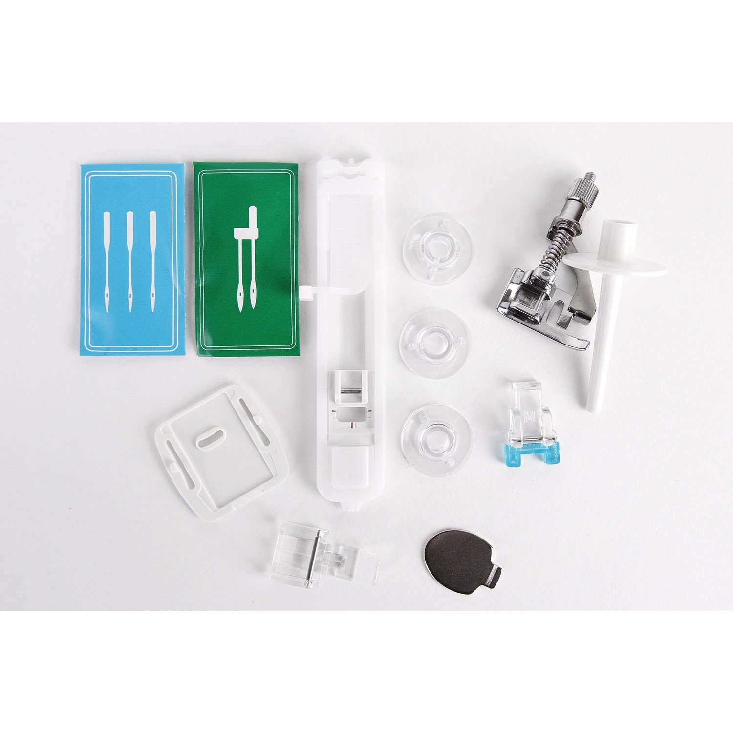 - Nadeln, Lampen, Nähfüße, Spulen, Messer, Werkzeuge, Stickrahmen