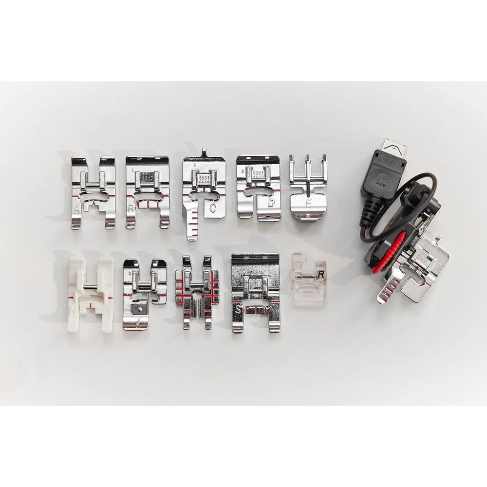 Ein umfangreiches Zubehörpaket für Quilter ist im Lieferumfang enthalten – von Linealen über Spezialfüße bis hin zum Verlängerungstisch.