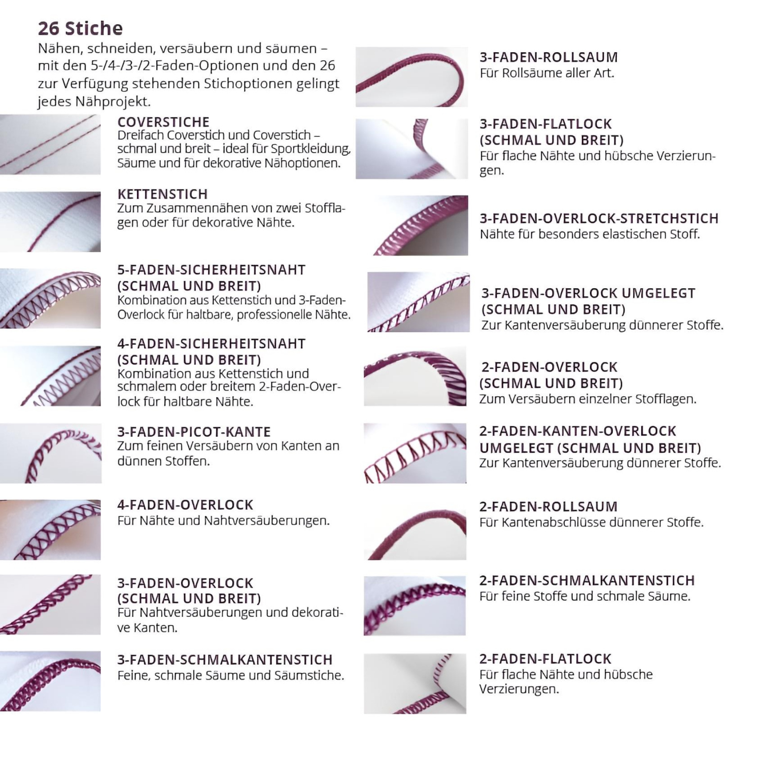 - 26 Stichoptionen inkl. Cover-, Ketten- und Sicherheitsstiche