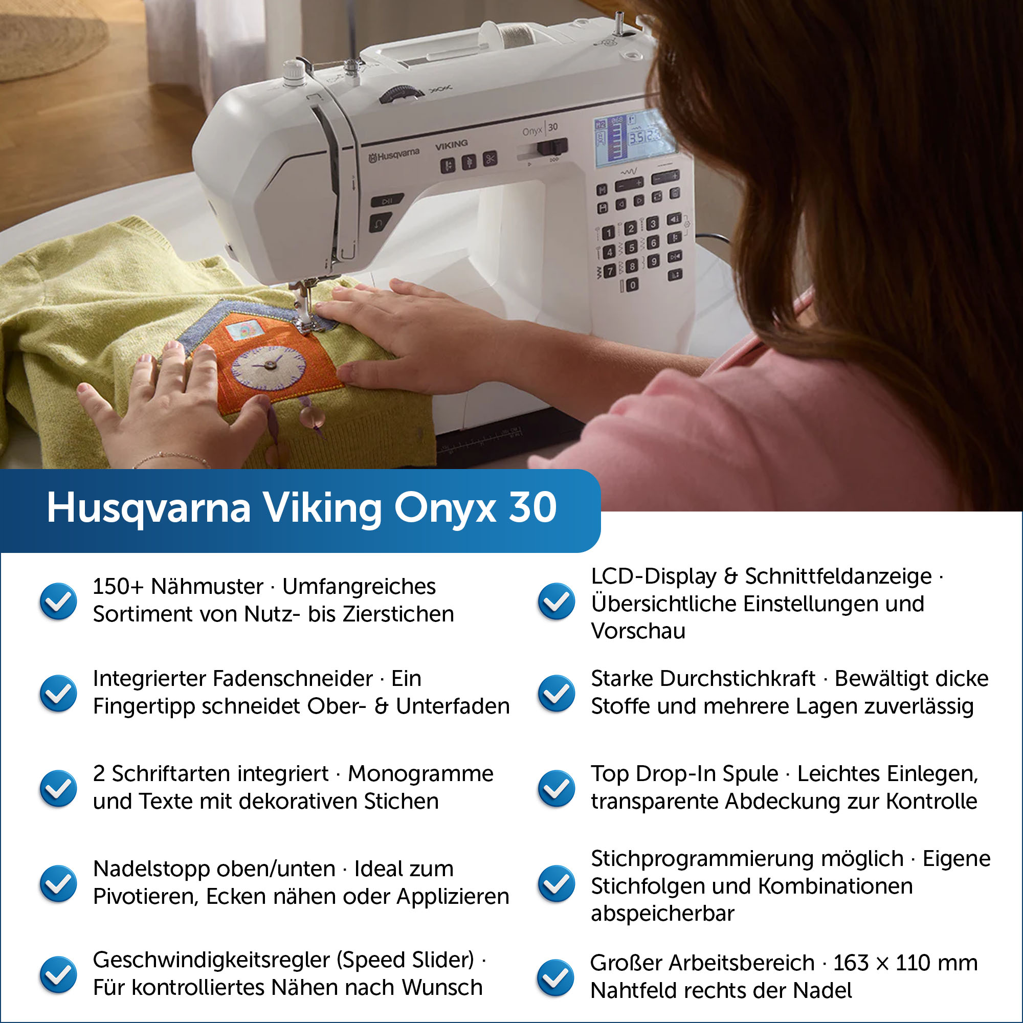 Die Husqvarna® Viking® Onyx™ 30 ist eine moderne, computergesteuerte Nähmaschine, die Ihnen maximale kreative Freiheit eröffnet und gleichzeitig professionelle Ergebnisse garantiert. Dank innovativer Technologie, einfacher Bedienung und leistungsstarker Funktionen begleitet Sie dieses Modell zuverlässig vom ersten Entwurf bis hin zum fertigen Nähprojekt.