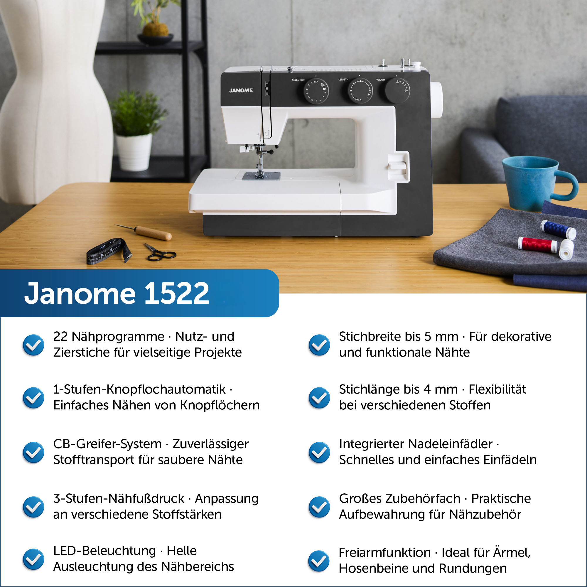 - 22 integrierte Nähprogramme