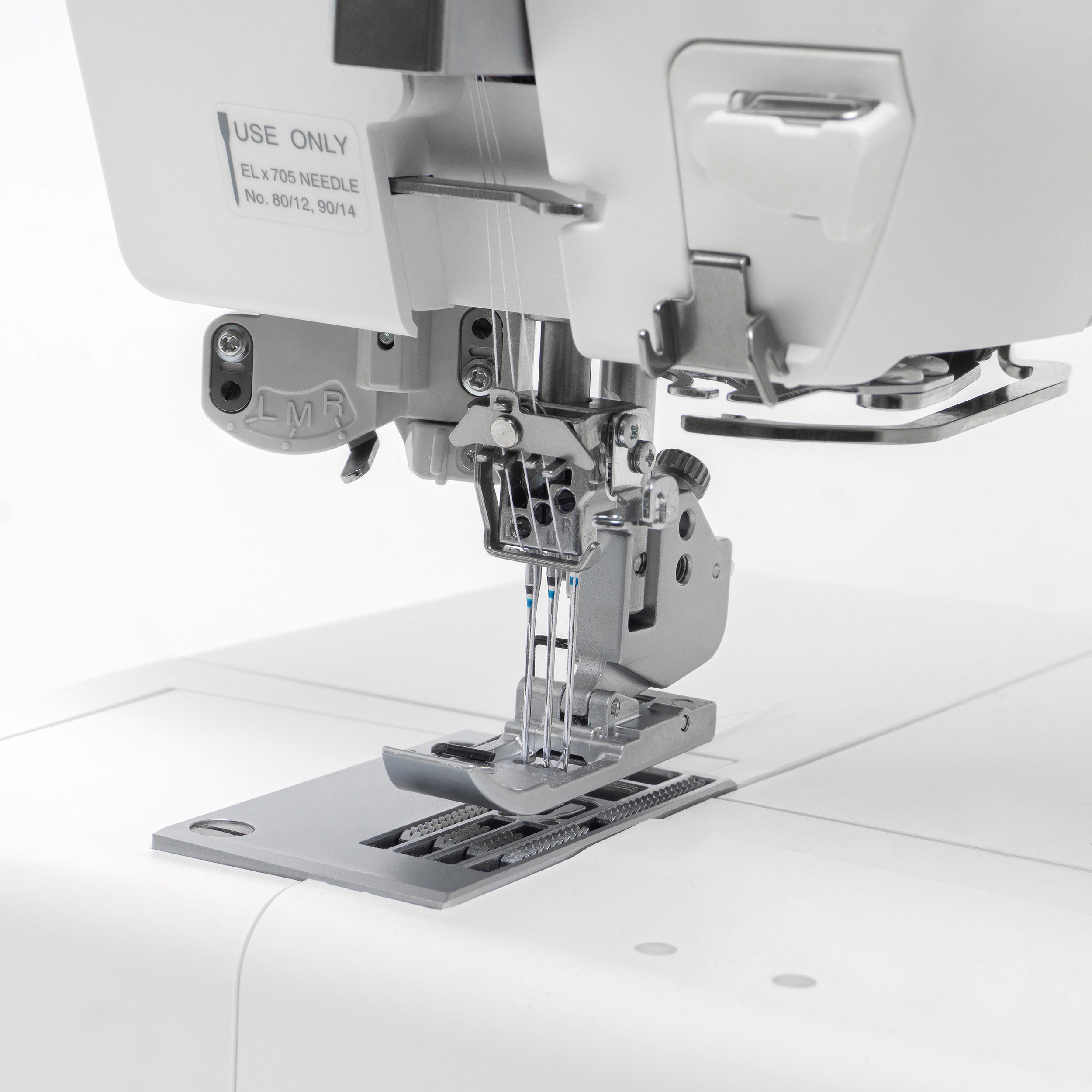 Mit dem großen Durchlass von 143 mm Breite und 100 mm Höhe bietet die 3000P deutlich mehr Platz für Nähgut und Hände. Dadurch lassen sich Covernähte auch innerhalb größerer Projekte komfortabel nähen. Gerade Nadeln unterstützen dabei saubere, korrekte Nähte ohne unerwünschten Stoffschub.