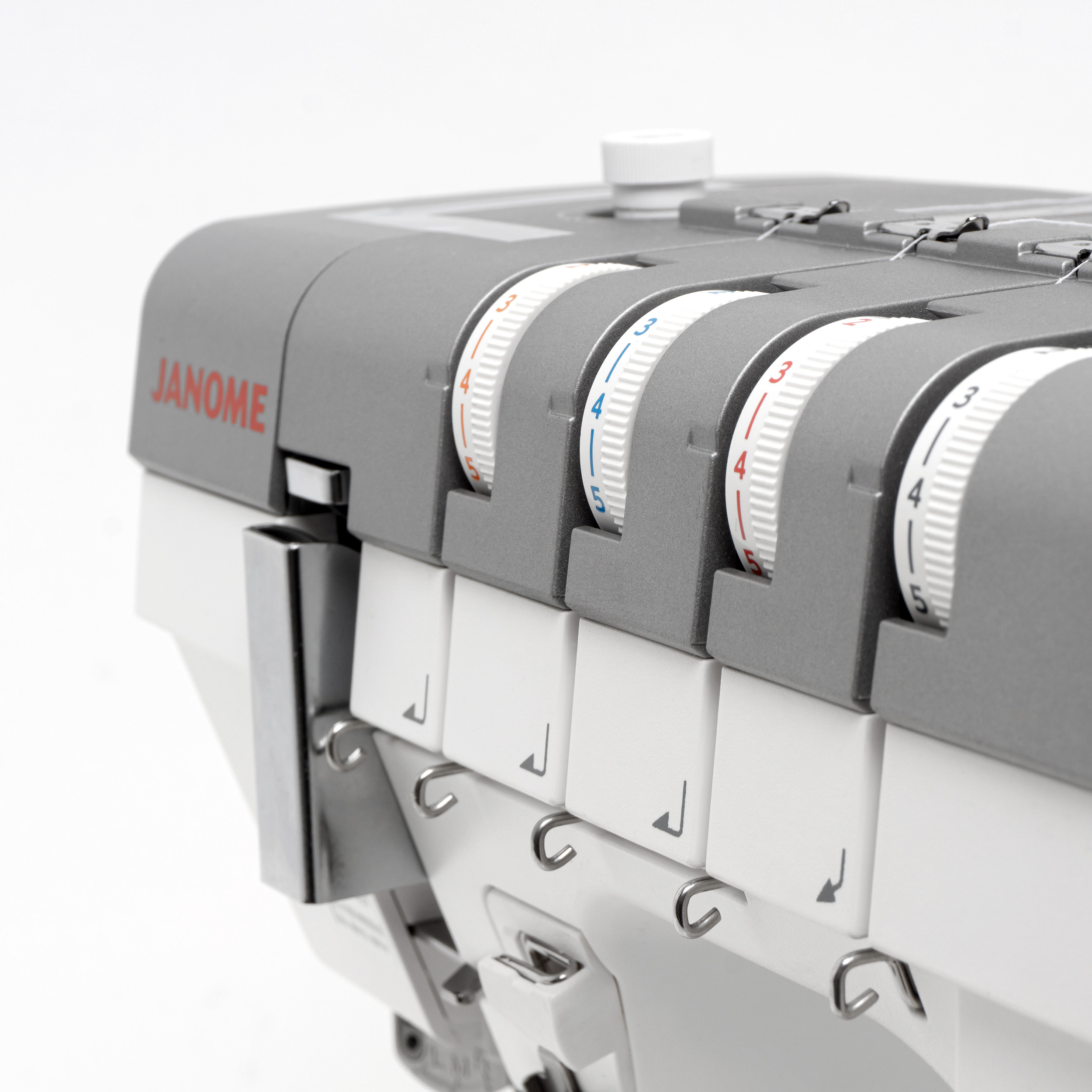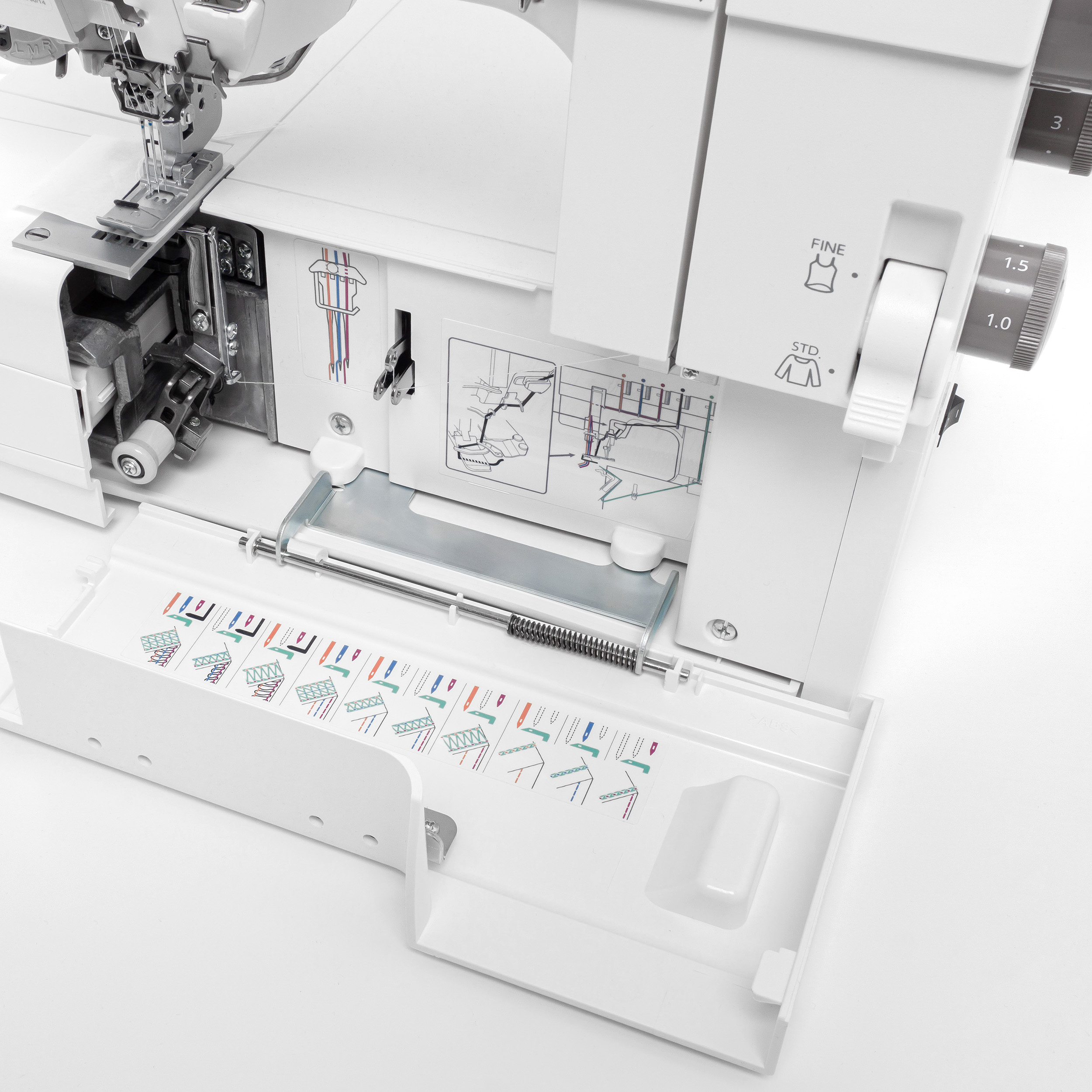 Die Top-Cover-Stich-Fadenführung ist bereits integriert – es müssen keine Zusatzteile montiert werden. Mit wenigen Handgriffen ist die Maschine für den Top Cover Stich startklar und Sie können direkt loslegen.