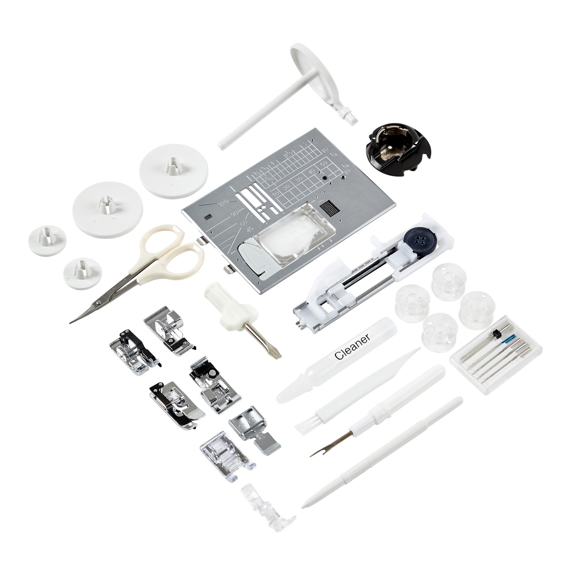- 300 integrierte Nähprogramme, 12 Knopflocharten, 6 Nähschriften, 241 Stickmuster und 20 Stickschriften