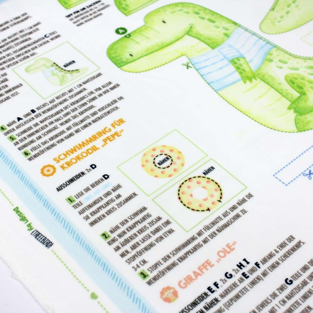 Die einzelnen Schnittteile sind bereits direkt auf einem hochwertigen Baumwollstoff (80 x 155 cm) aufgedruckt – inklusive farbiger Anleitung und Nahtzugabe. Du musst die Motive nur noch ausschneiden und kannst direkt mit dem Nähen starten – perfekt für Anfänger und kreative Familienprojekte.