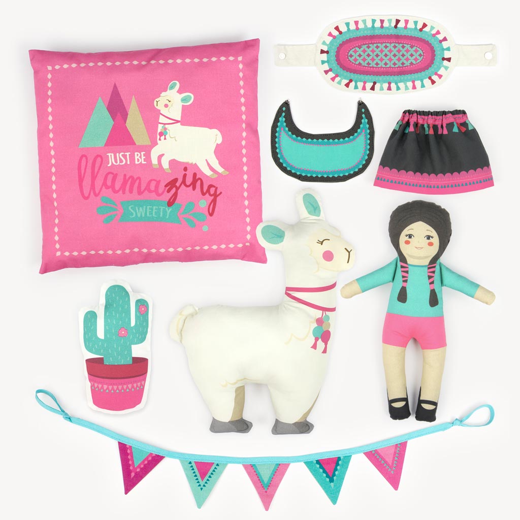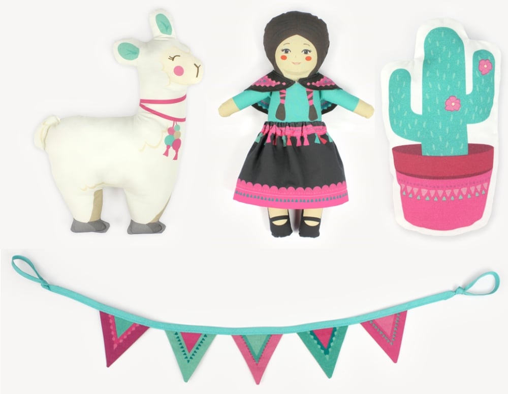 - Inklusive: Stoffpuppe „ELENA“, Rock, Poncho, Lama „LALA“, Satteldecke, Kaktus, Wimpelkette, Zierkissen