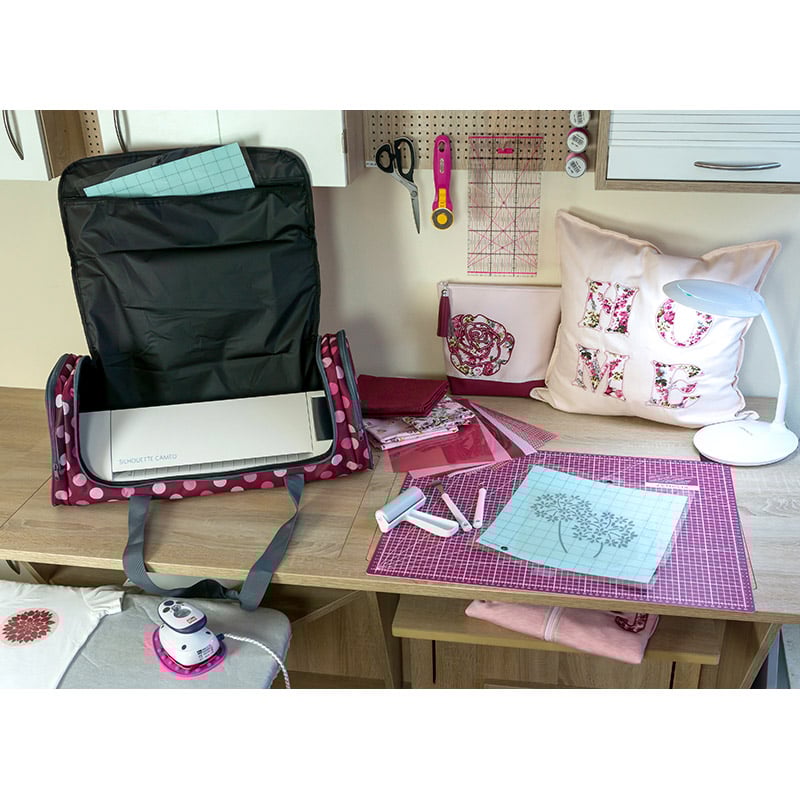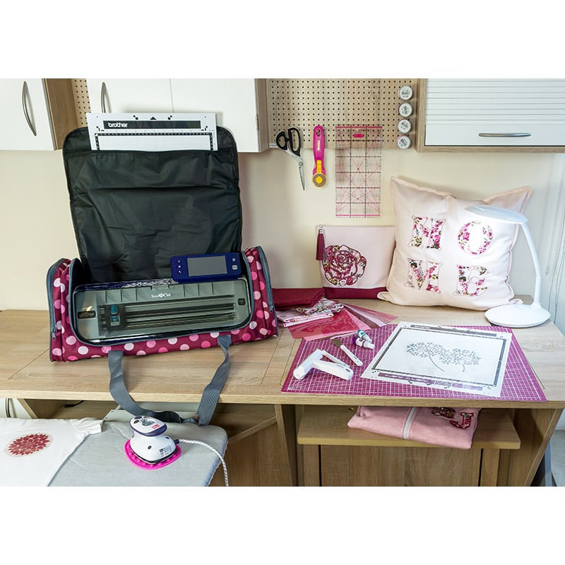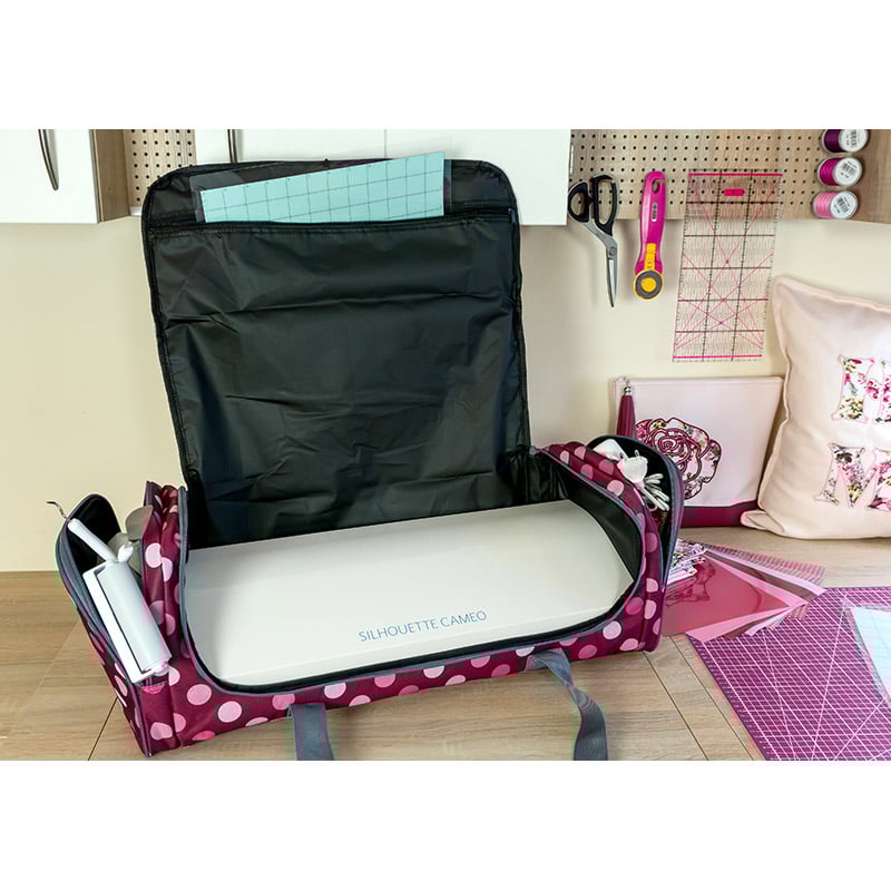 Ein langlebiger Außenstoff in frischem Punkte-Design, stabile Tragegurte und ein durchdachter Innenraum machen diese Tasche zu einem Must-have für Plotterfans – ganz gleich ob für zu Hause, den Kurs oder den kreativen Einsatz unterwegs.