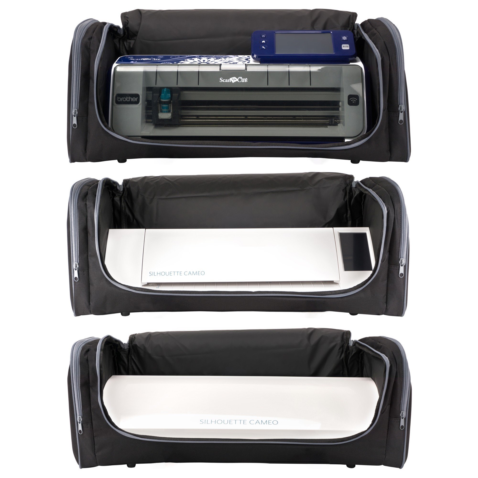 Die große Innentasche im Deckel schützt Plottermatten und empfindliche Materialien vor Knicken. Zwei großzügige Außentaschen bieten zusätzlichen Stauraum für Netzkabel, Werkzeuge oder Folienrollen.