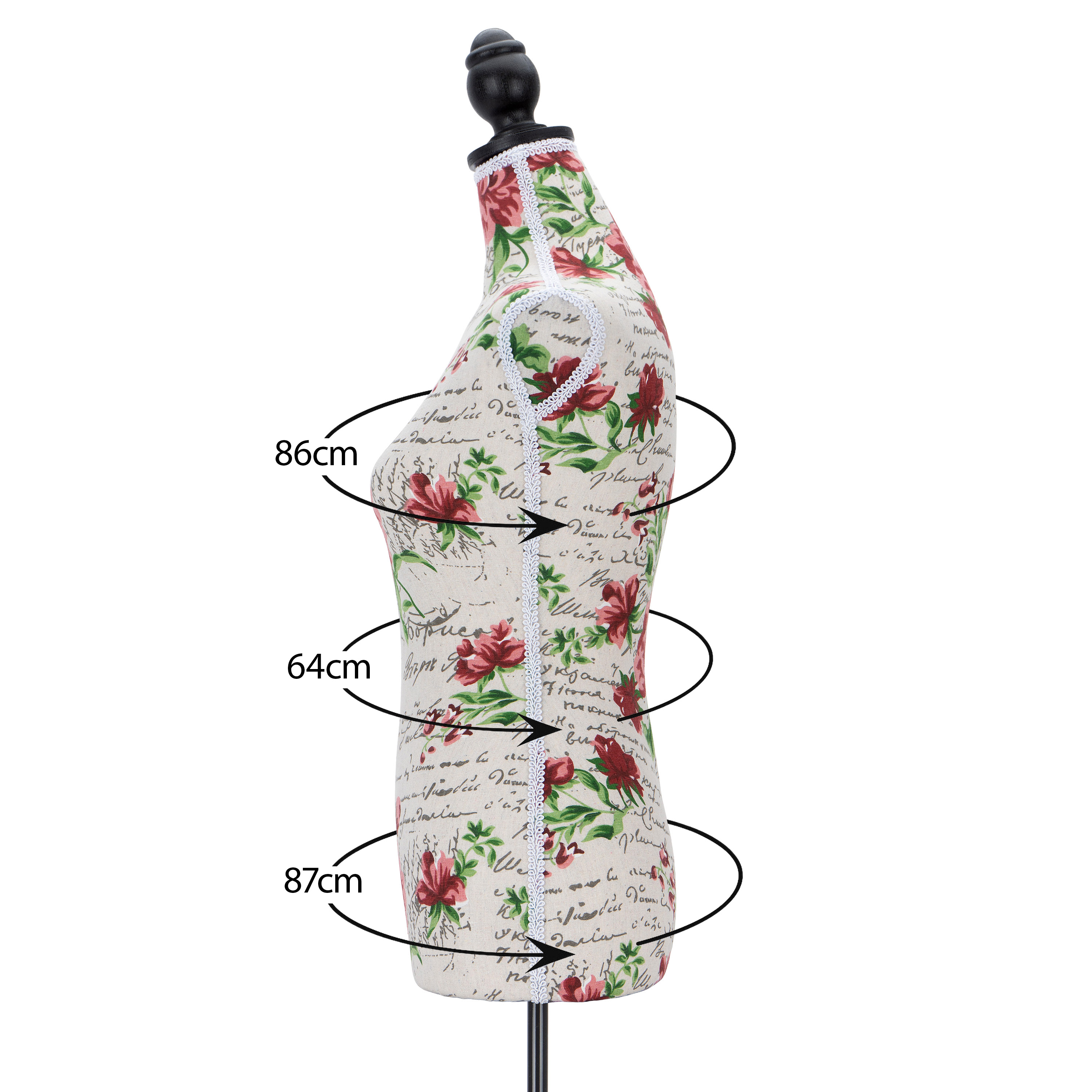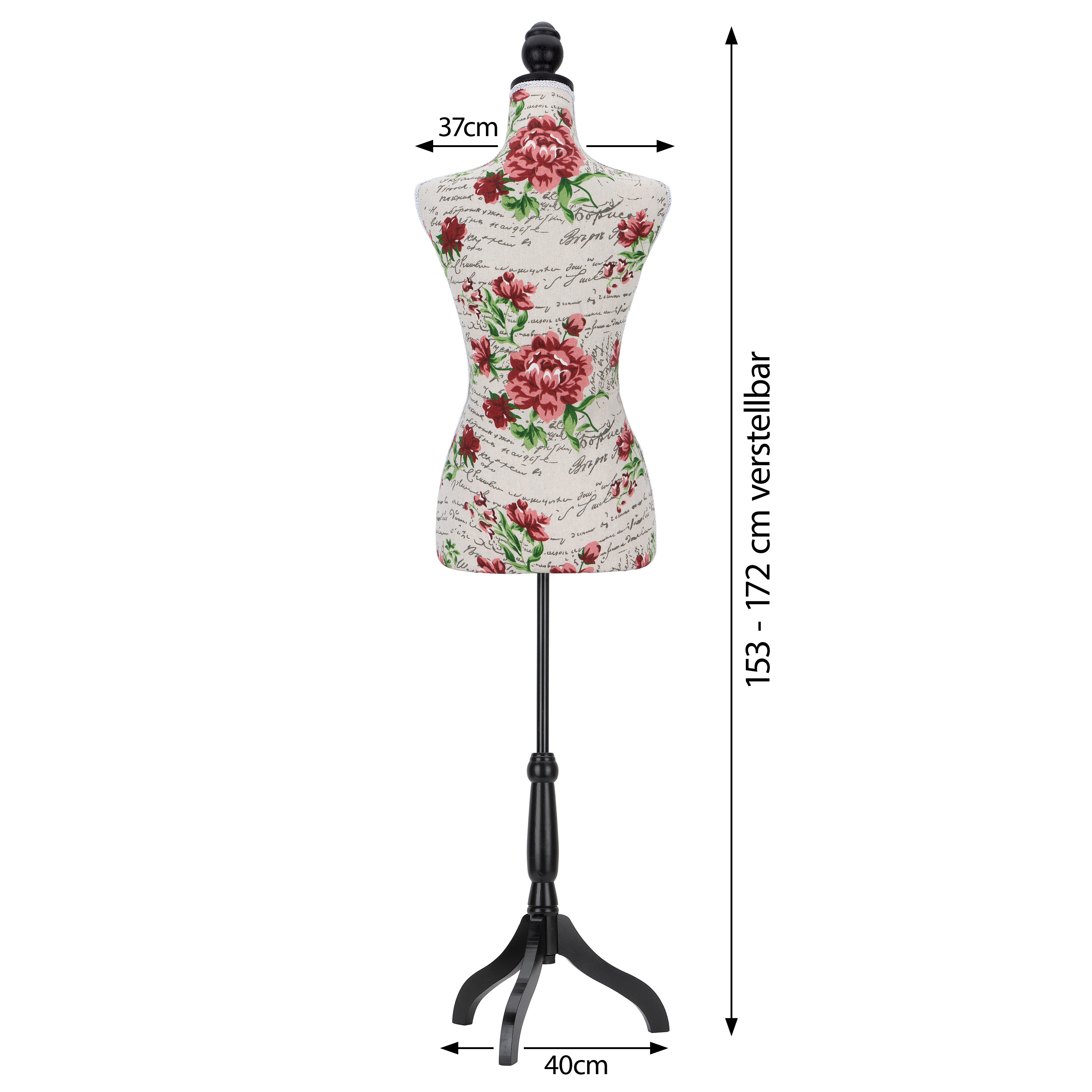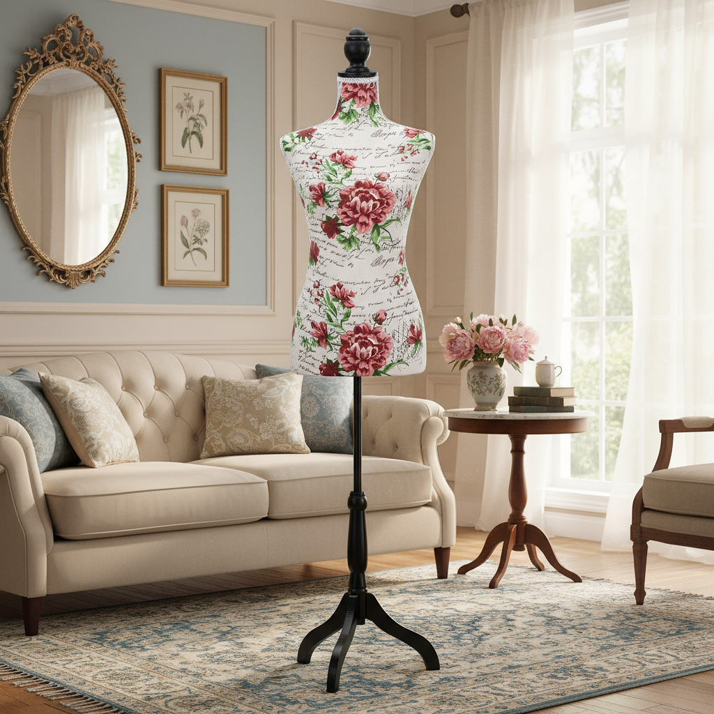 Die Semplix Schneiderbüste mit floralem Rosen-Druck auf einem Baumwollbezug vereint Funktionalität mit dekorativem Charme und bringt ein romantisches Flair in jedes Nähzimmer oder Atelier. Der naturfarbene Baumwollbezug aus festem Calico-Gewebe mit feinem Rosenprint verleiht der Büste eine besonders wohnliche und handwerkliche Note. Dank des stabilen Holz-Tripods und des schwarzen Halsabschlusses entsteht ein harmonischer Kontrast, der Eleganz und Natürlichkeit verbindet. Perfekt geeignet, um Tücher, Schmuck oder leichte Kleidungsstücke stilvoll zu präsentieren.