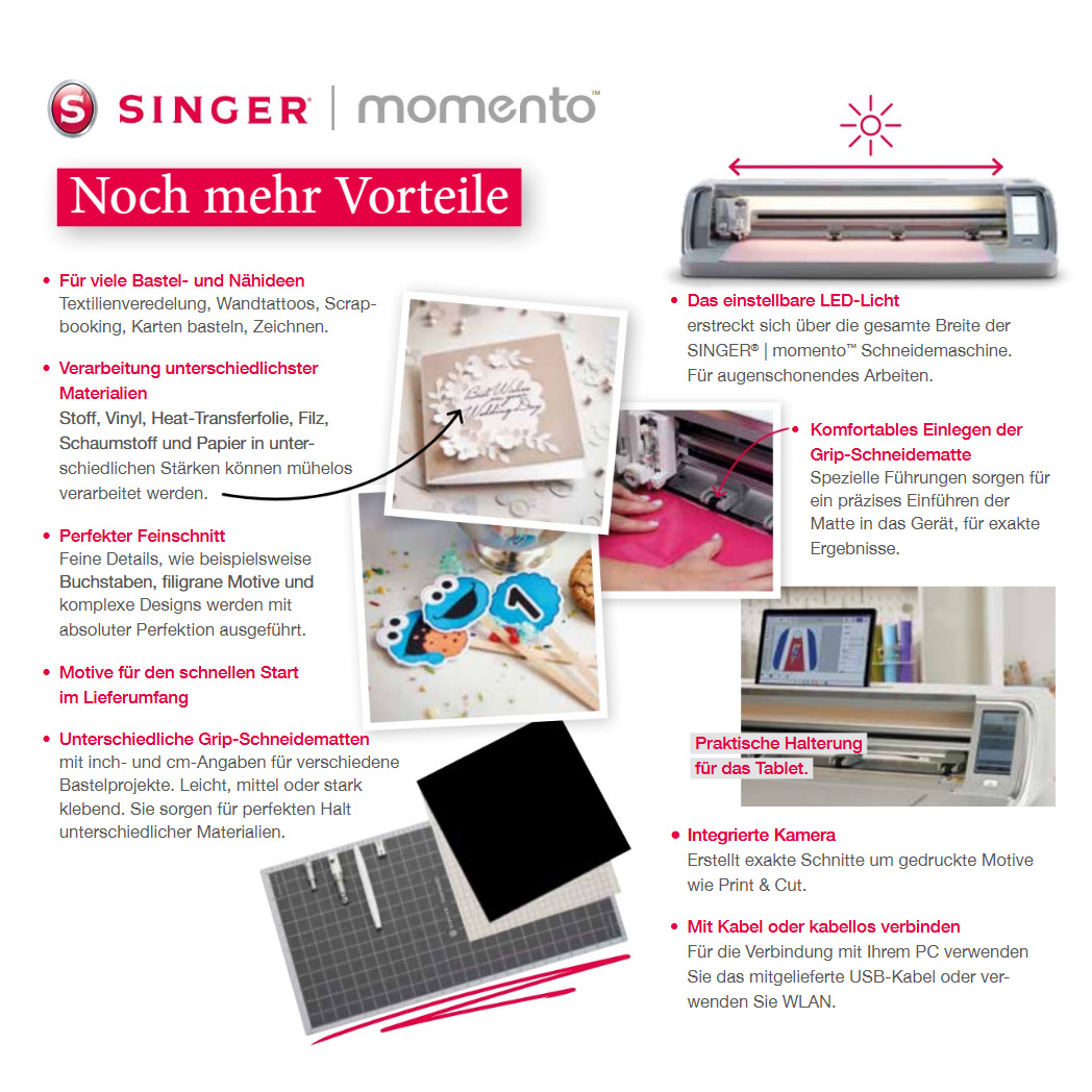 Der Singer momento™ Schneideplotter ist ein vielseitiges und besonders anwenderfreundliches Gerät für kreative Bastlerinnen und Designer. Mit seiner präzisen Schneidetechnologie schneiden Sie eine große Bandbreite an Materialien – von Papier über Vinyl bis hin zu Stoff – und setzen damit sowohl Dekoideen als auch textile Projekte souverän um.