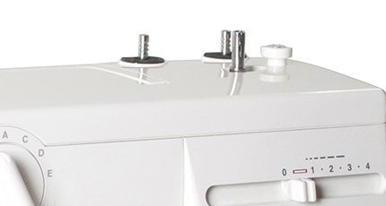 Die Stichauswahl erfolgt bequem über einen praktischen Drehknopf. Zwei versenkbare Garnrollenhalter ermöglichen das Nähen mit Zwillingsnadel. Außerdem zeigt die Stichanzeige immer den passenden Nähfuß an – für optimale Nähresultate.
