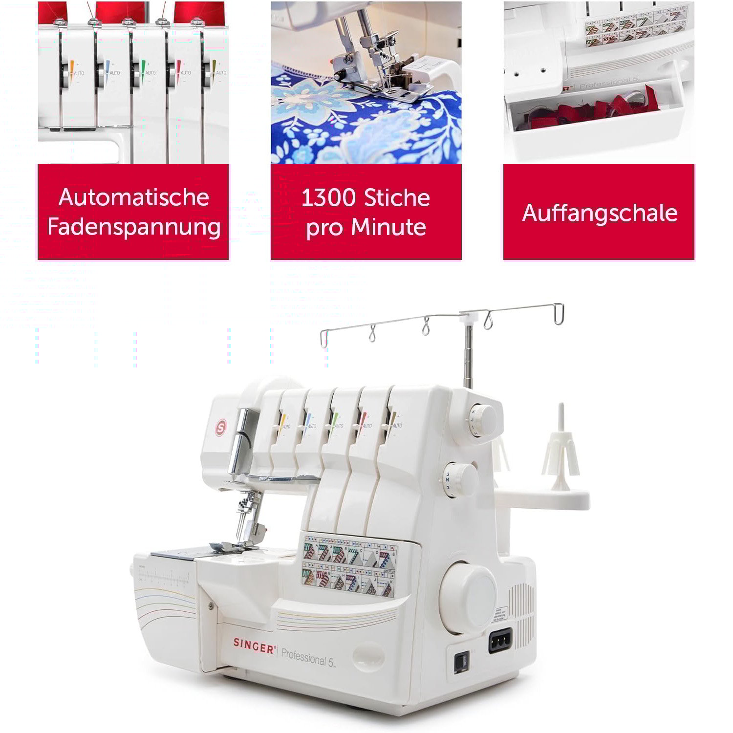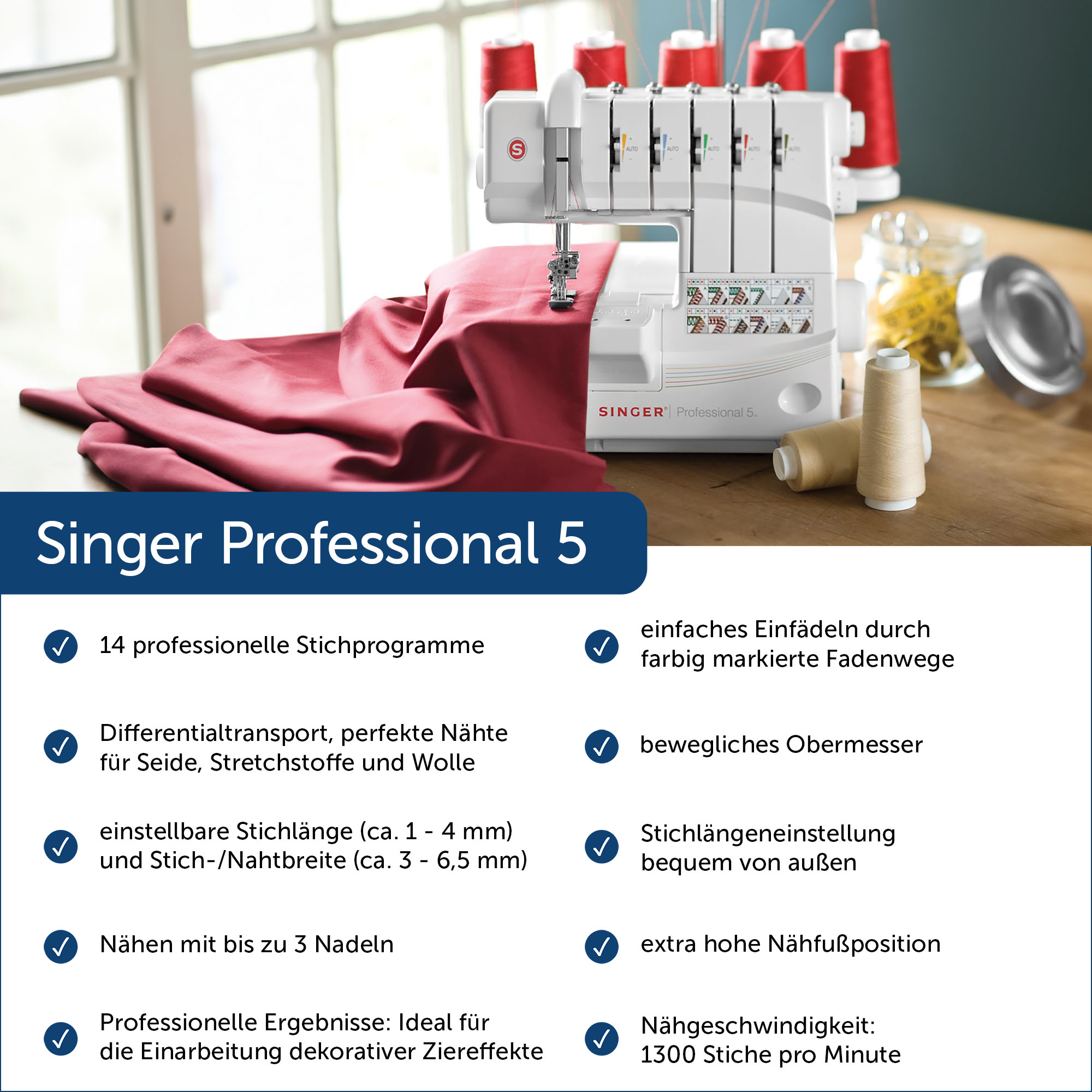 Die SINGER® Professional 5 ermöglicht es, mit 2 bis 5 Fäden mehrere Arbeitsgänge gleichzeitig zu erledigen. Modernste Technik garantiert dabei beste Ergebnisse bei einfacher Handhabung.